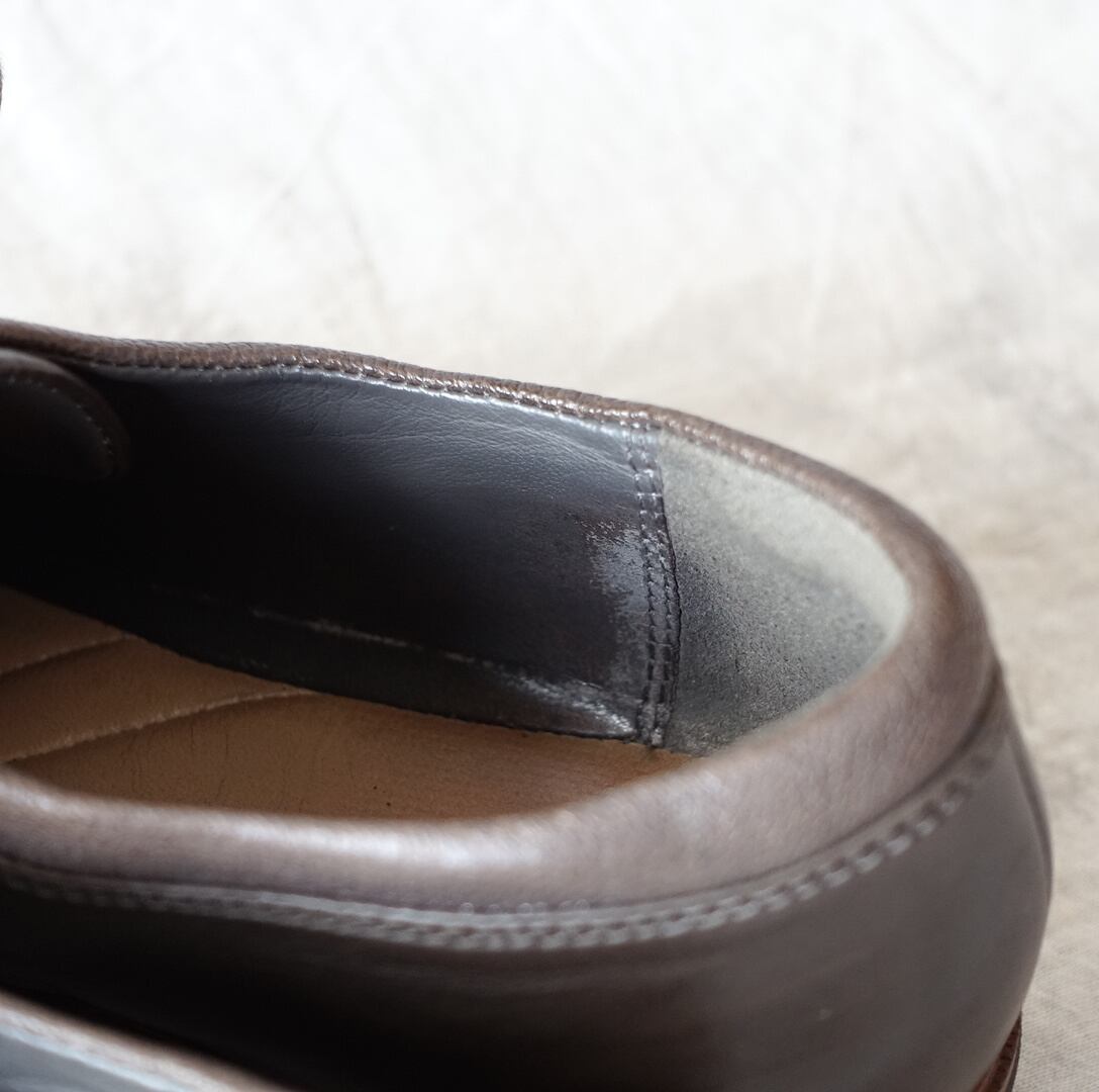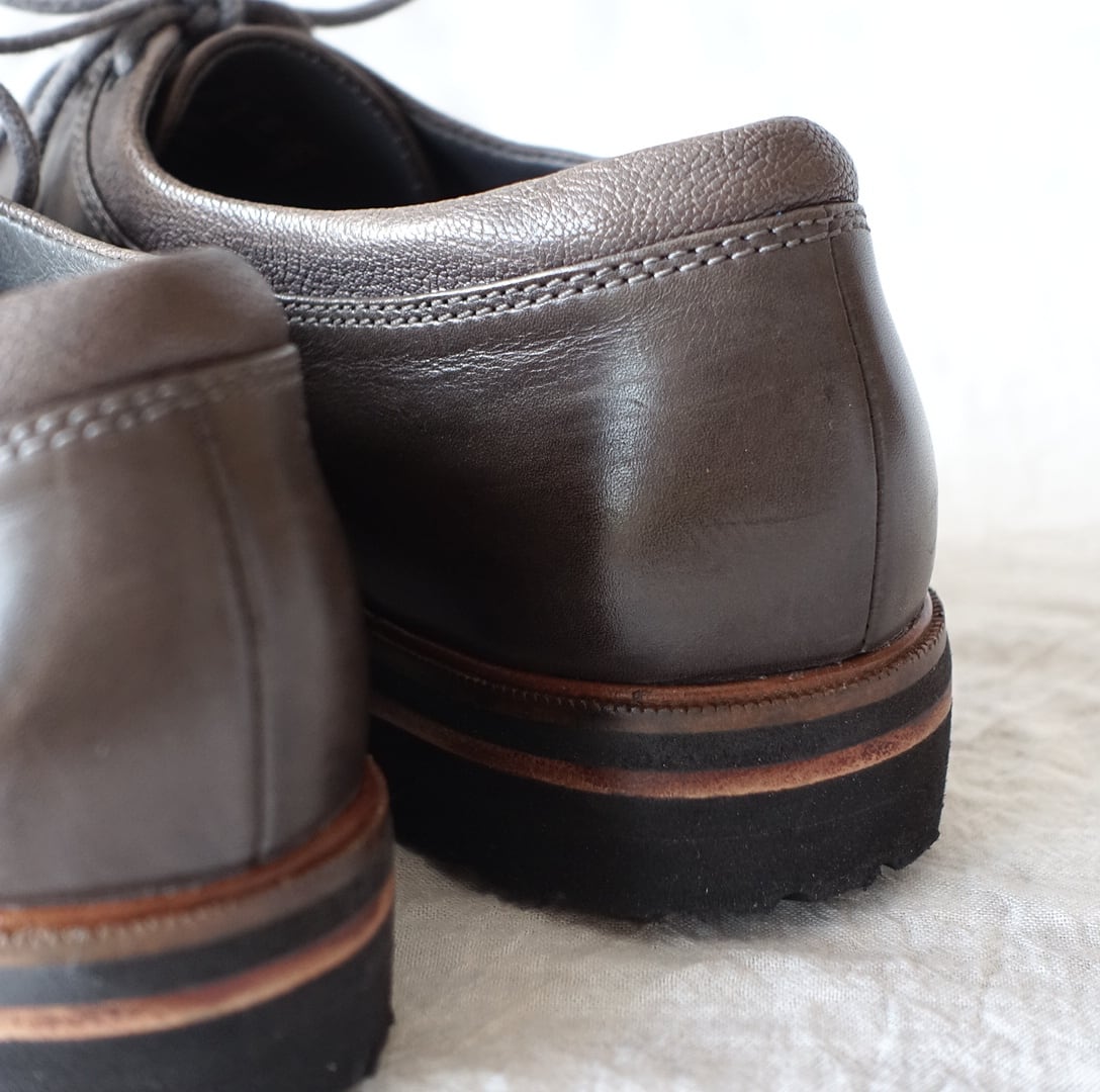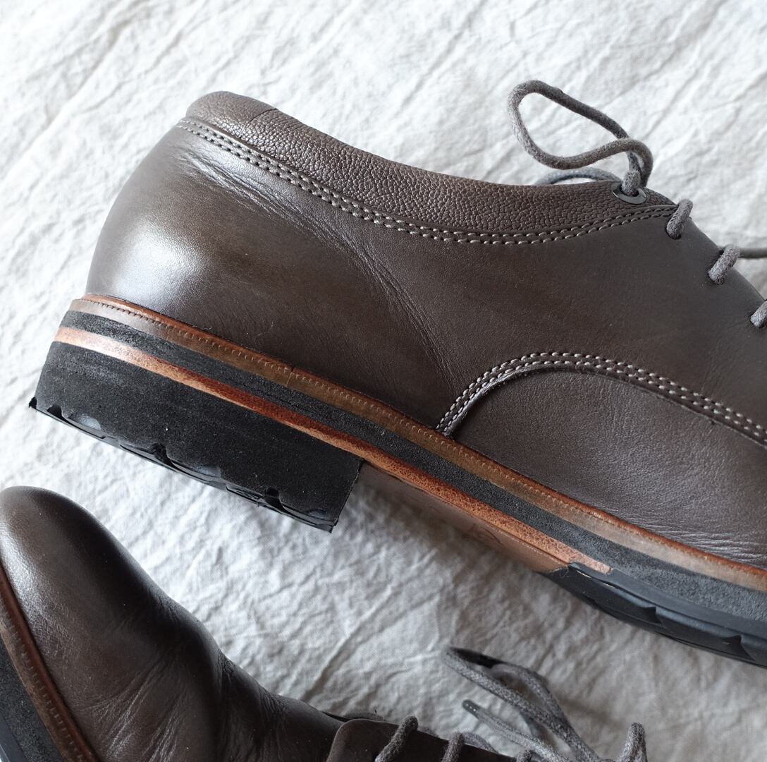 革の経年変化もあるのかもしれませんが、光の当たり具合で濃いめのグレー、人によってはカーキに見える方もいるかもしれません。少し特徴のある色味のレザーです。