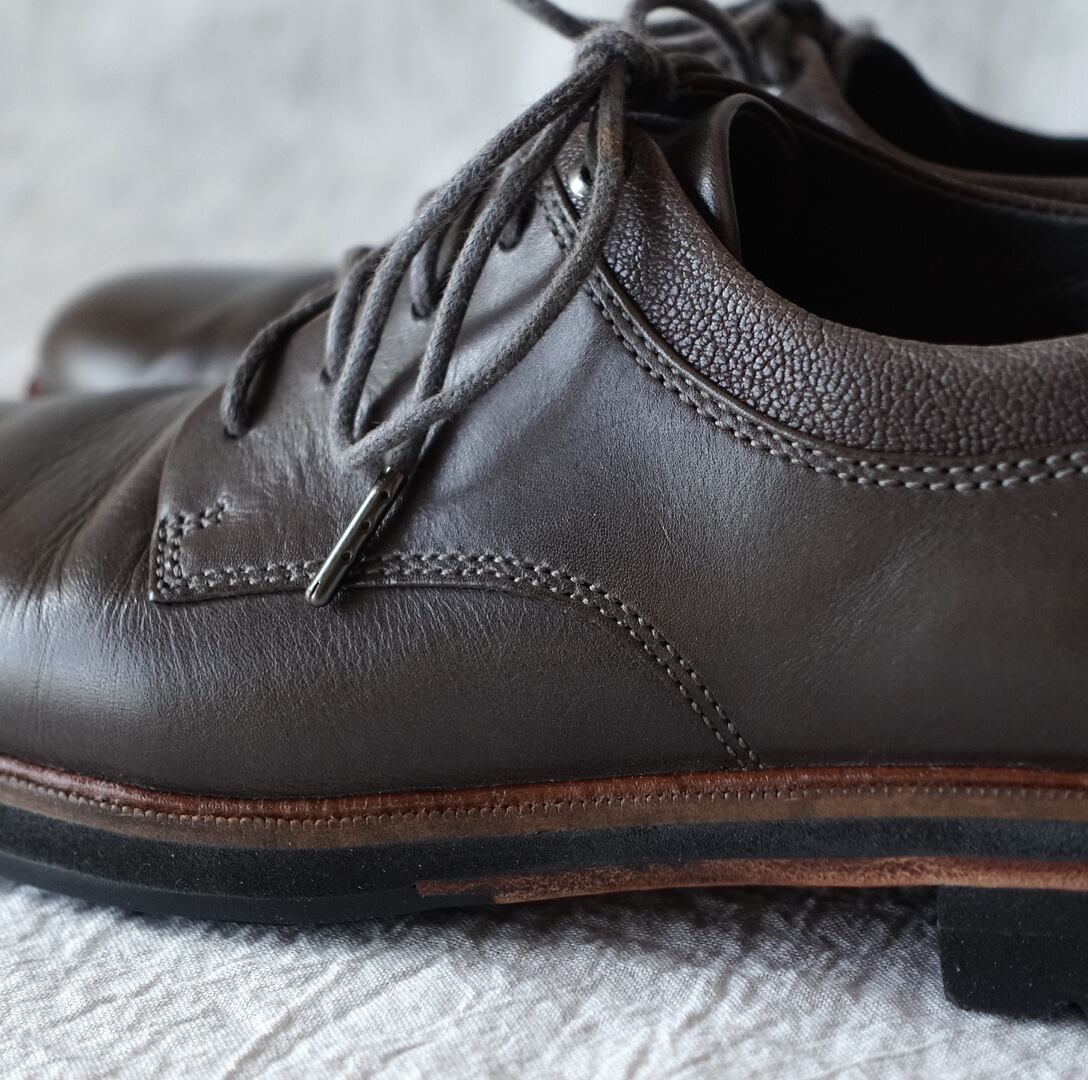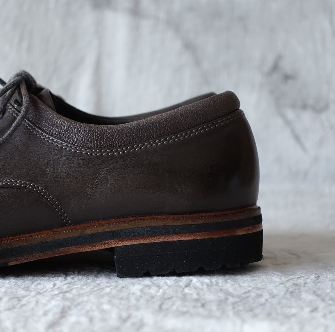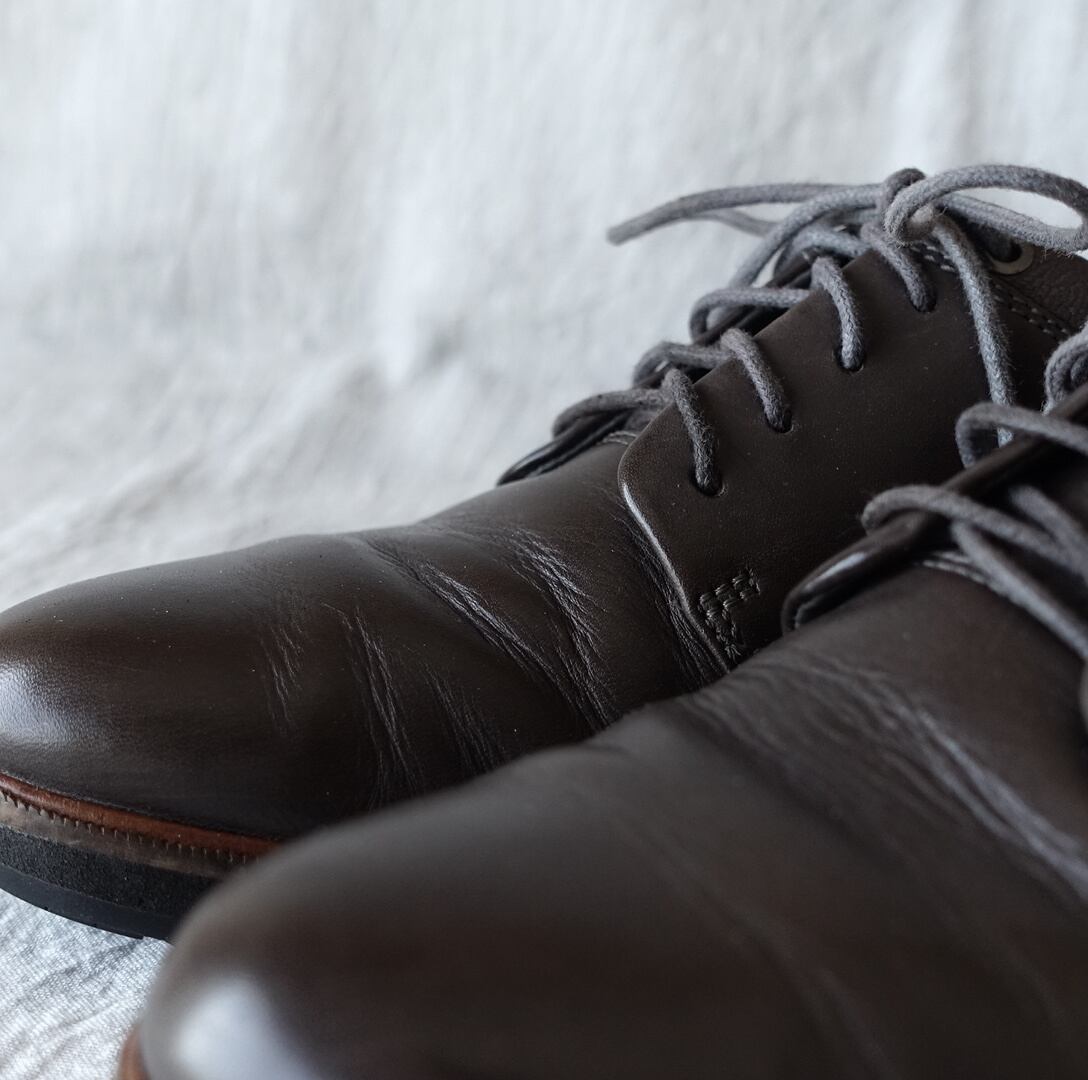 革の経年変化もあるのかもしれませんが、光の当たり具合で濃いめのグレー、人によってはカーキに見える方もいるかもしれません。少し特徴のある色味のレザーです。