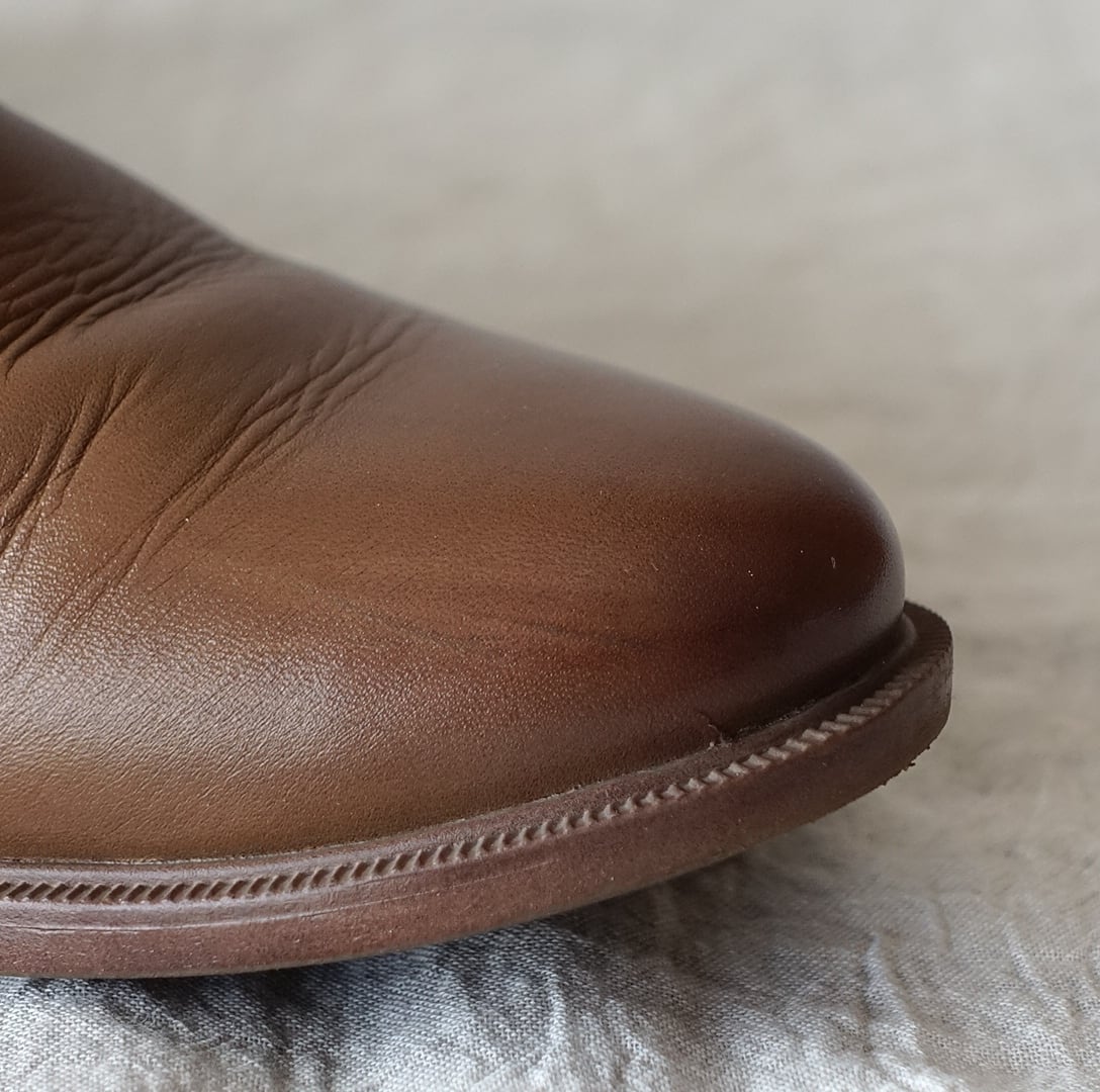 革の硬さや乾燥が気になる場合は、靴クリームを使用することをお勧めします。通常は「デリケートクリーム」をおすすめしますが、革に艶を出したい場合、色の補色を行いたい場合は、それ用のクリームやワックスを使用することもおすすめします。