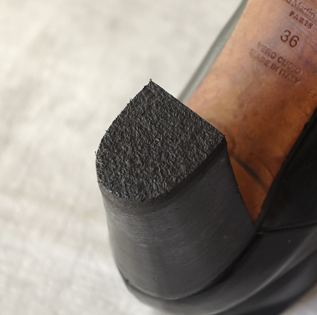 靴底の踵部分と前足部が削れていたので修理しています。