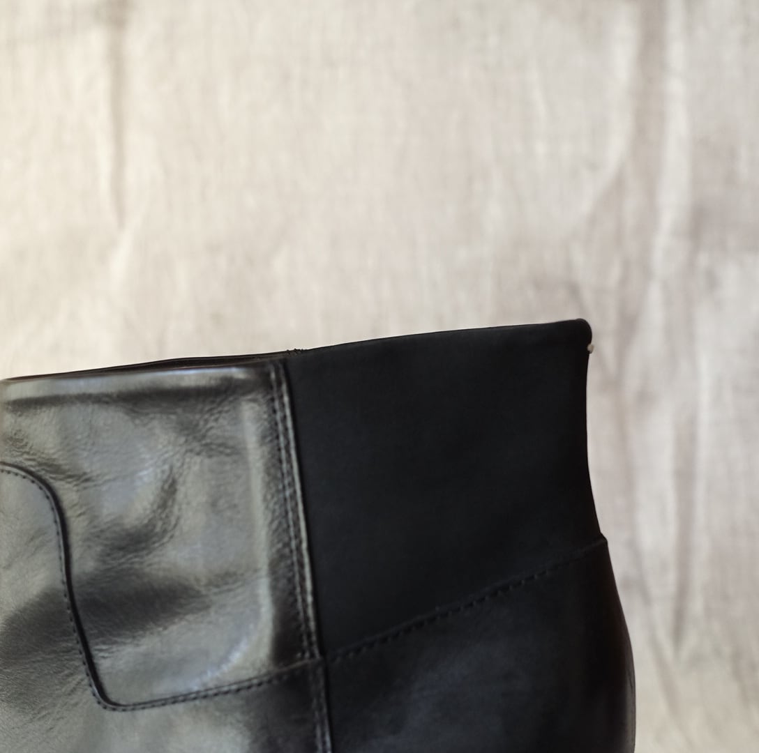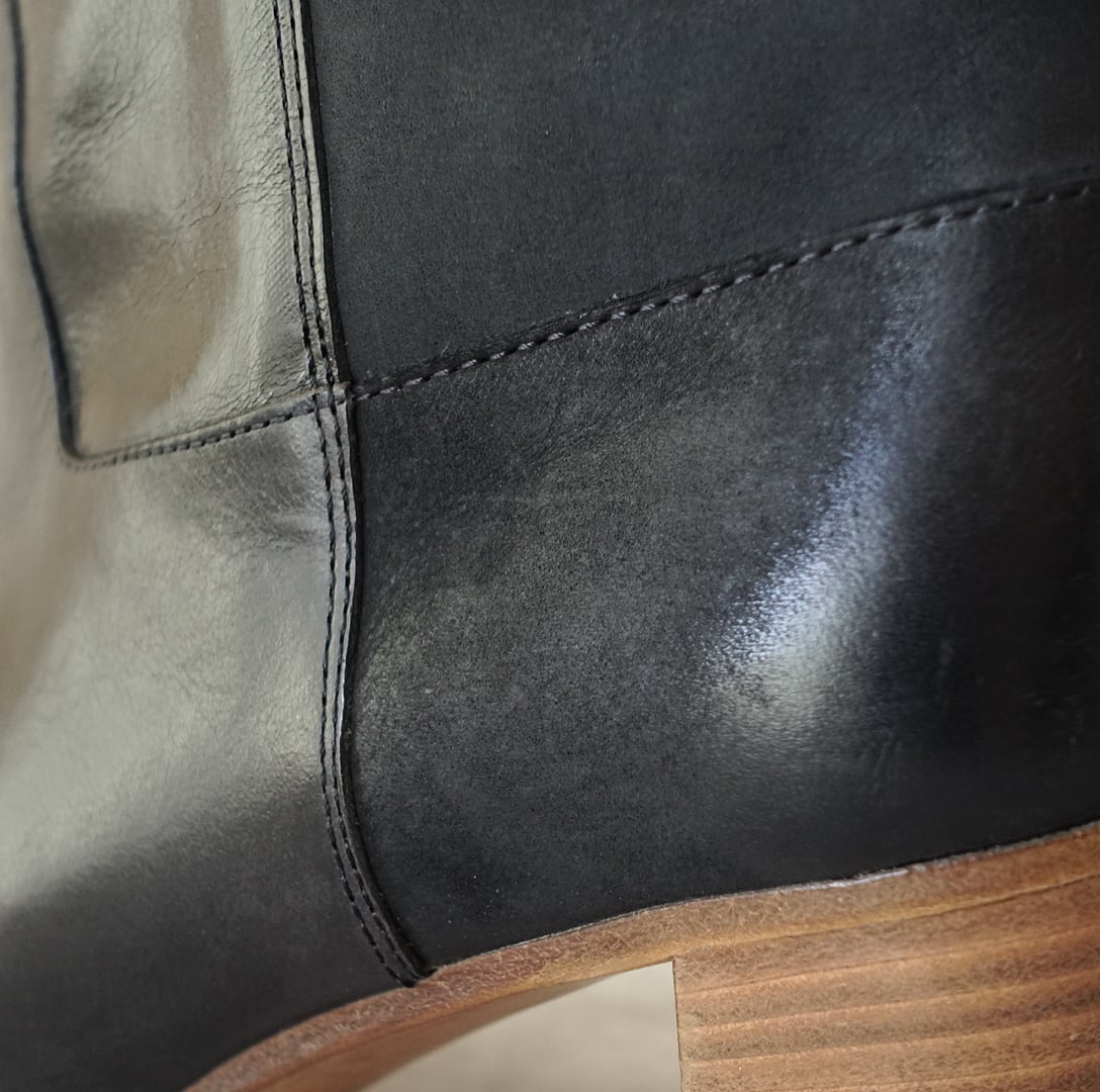 黒いスムースレザーとスエードを組み合わせたショートブーツです。テクスチャーの違うレザーがさりげなく主張します。