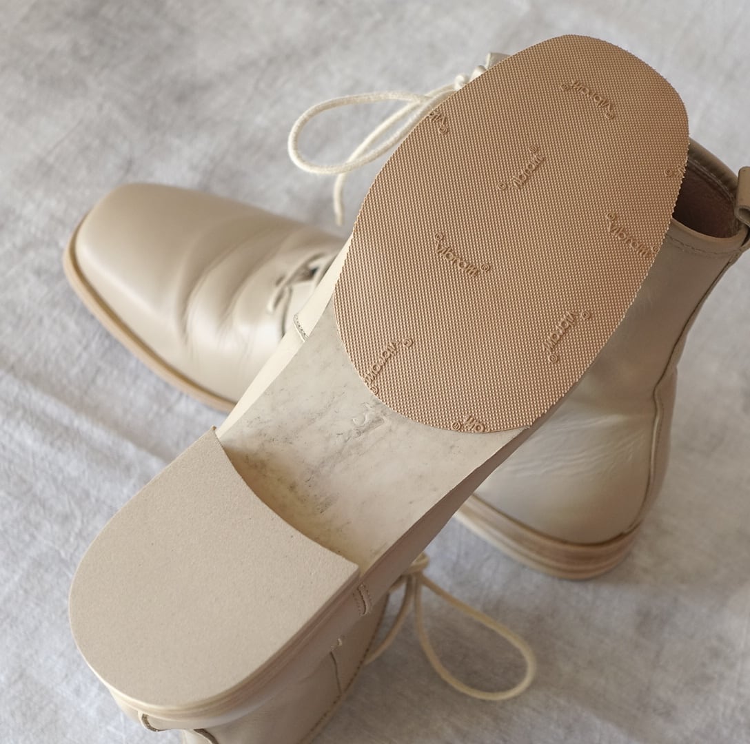 靴底の踵部分と前足部が削れて減っていたので修理しています。