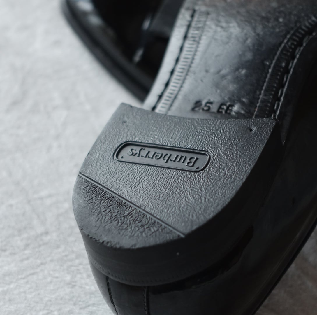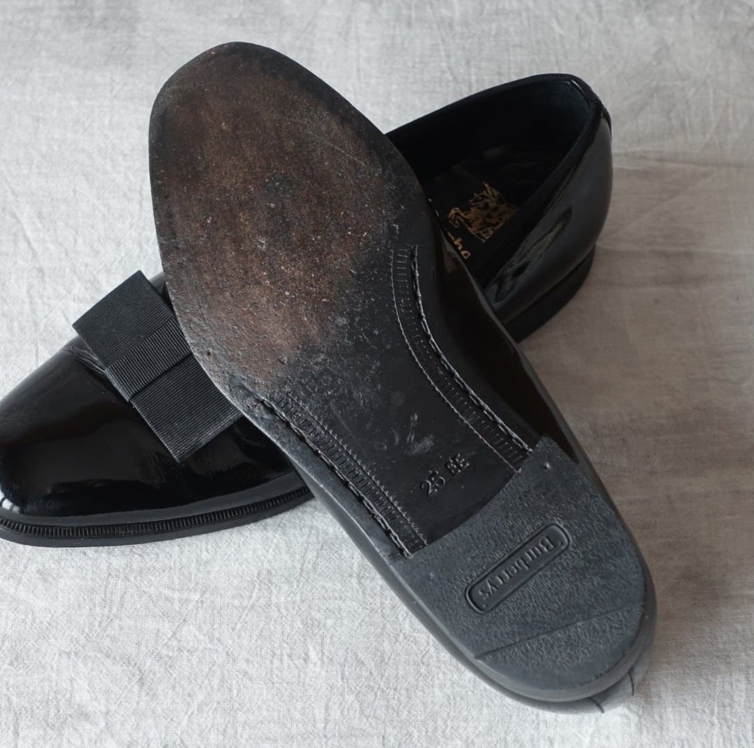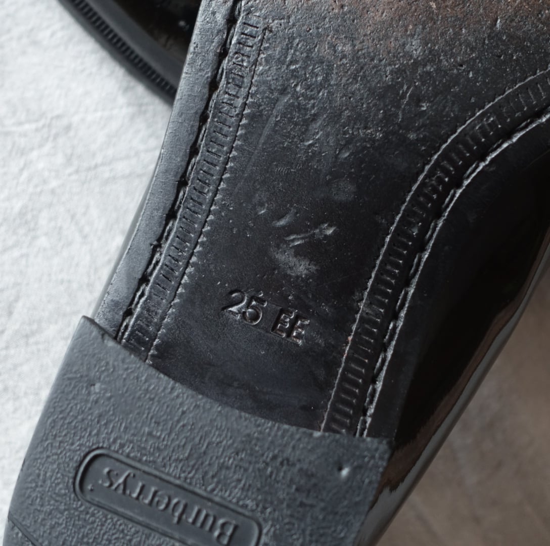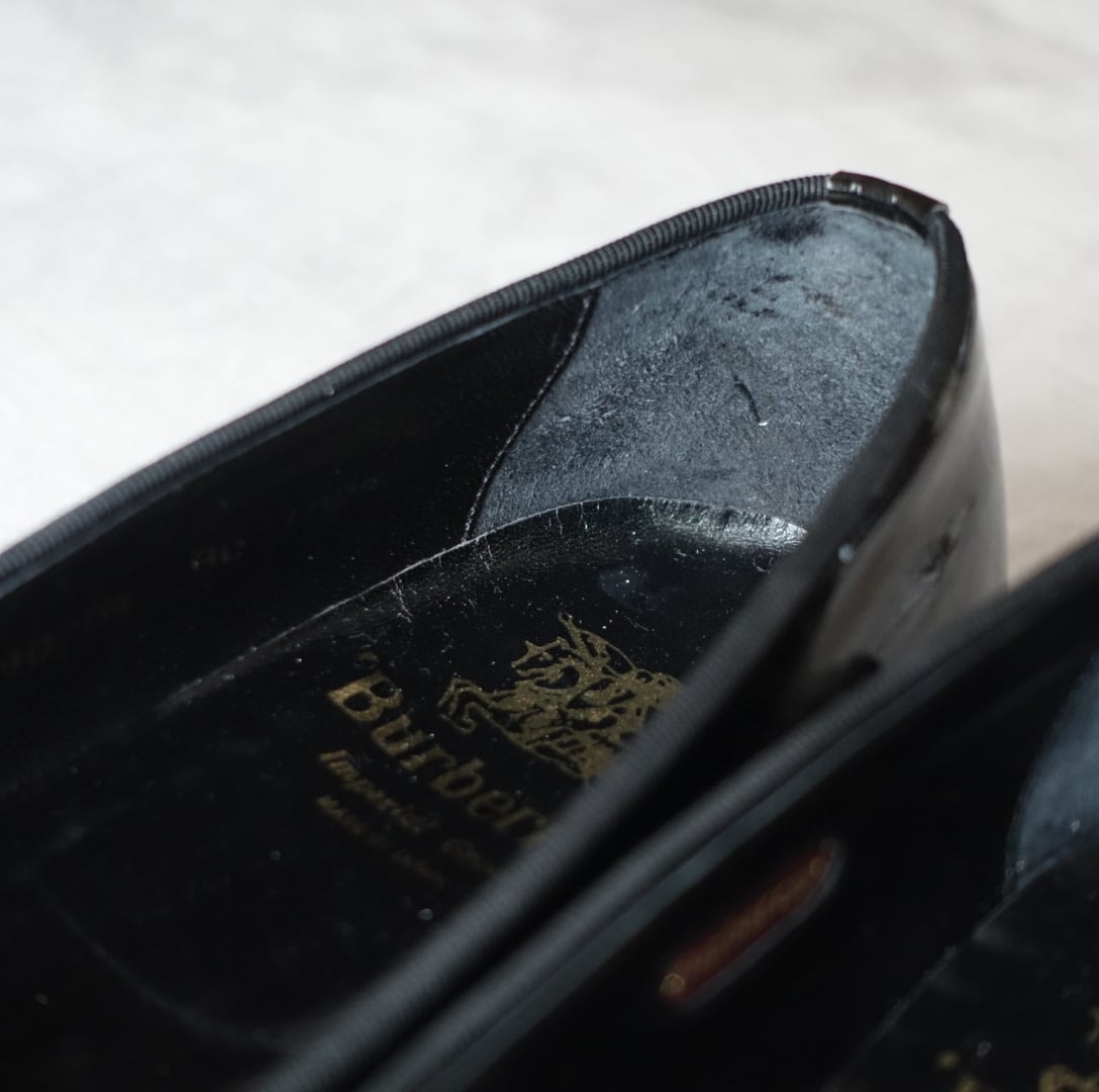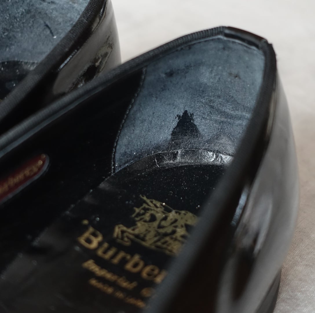細かい傷や履きシワ、汚れはありますがエナメル用のシューケアクリームで磨いてあるので光沢があります。