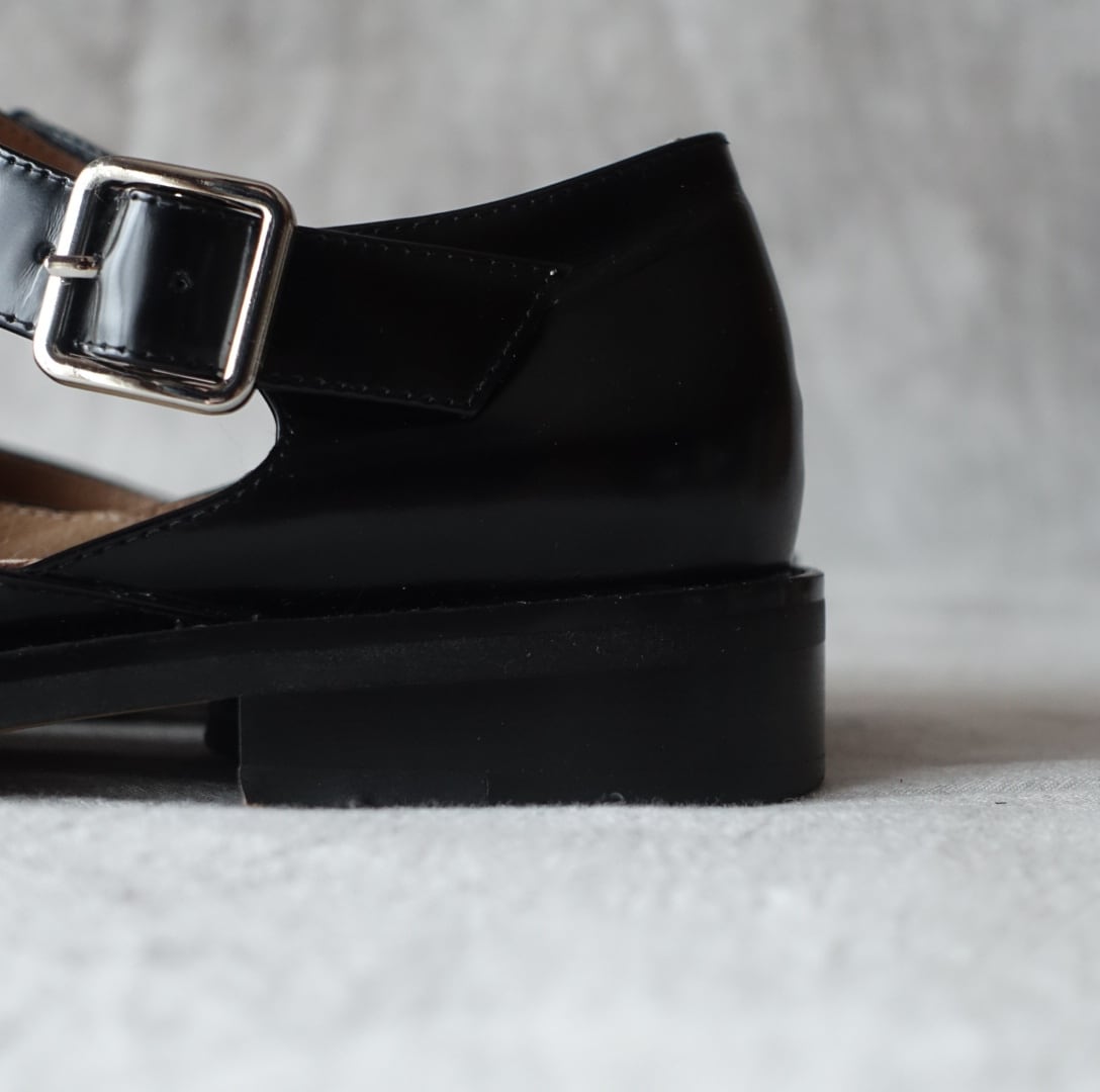 光沢のあるレザーとスリムなトウスタイル、T字形状のストラップが足を縦長にスラっとした印象にします。