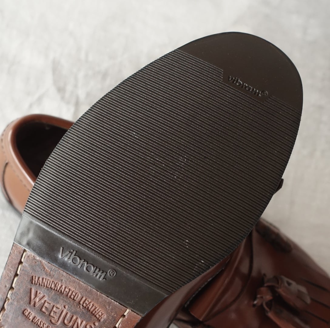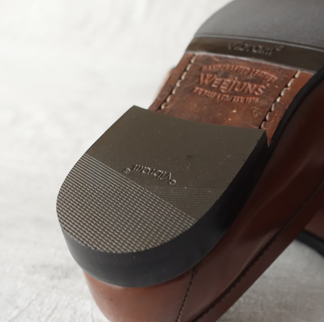 シンプルでフォーマルシューズに使われるような柄のVibramソールを用いて踵修理と半貼りをしています。